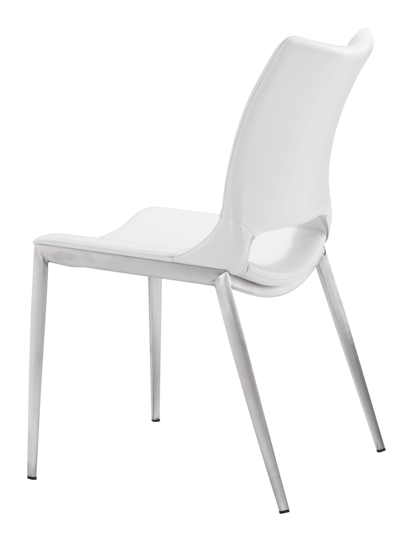 This sleek armless dining chair lets you sit back and relax in comfort. Its perfectly pitched back cradles you, while the sturdy steel frame supports your every move. The white faux leather seat is beautifully stitched adding a designer detail to a simple profile. Protective plastic feet will keep your floors from scratching. Gorgeous around your table, or pulled up to the desk in your home office.