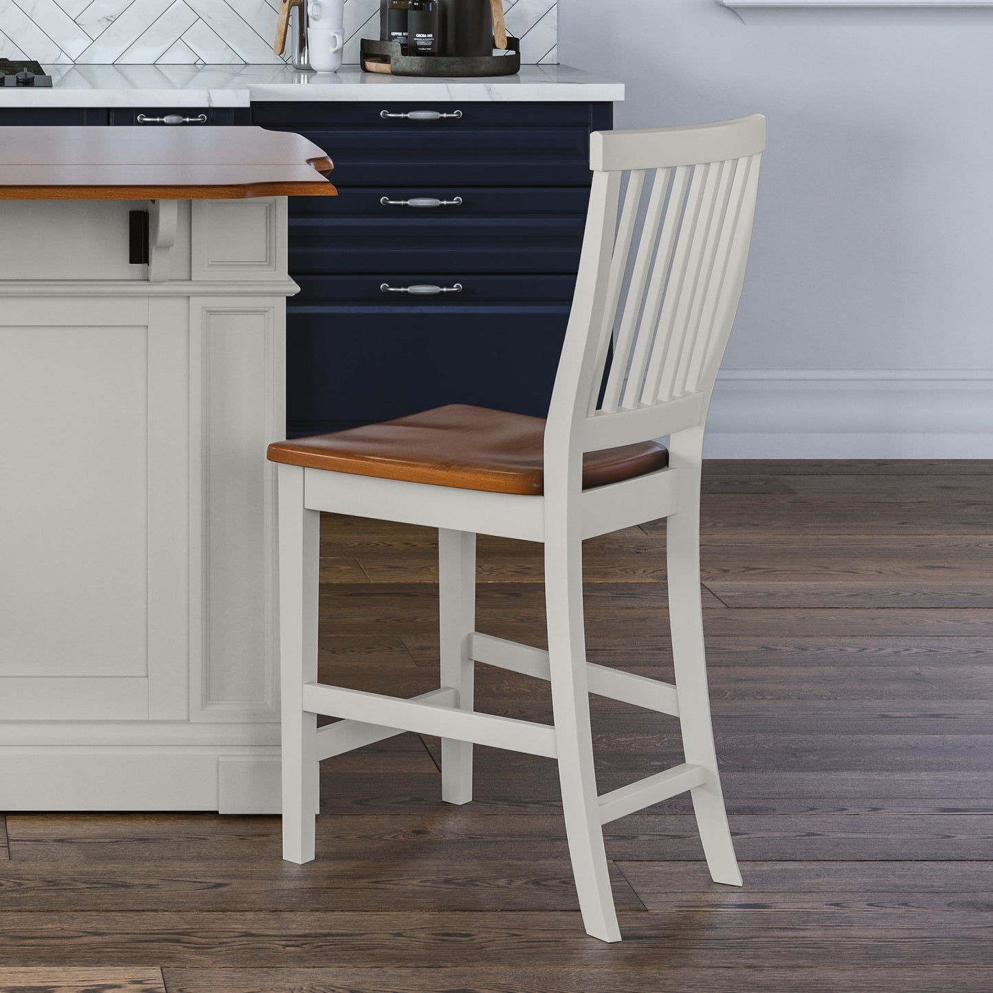 Pull up a stool to your home bar or kitchen island with this Homestyles Americana Counter Stool. The contoured seat and back mirror the curves of your body for outstanding comfort. The distressed oak seat provides a nice contrast to the off-white finish. The hardwood frame is durable and easy to clean.