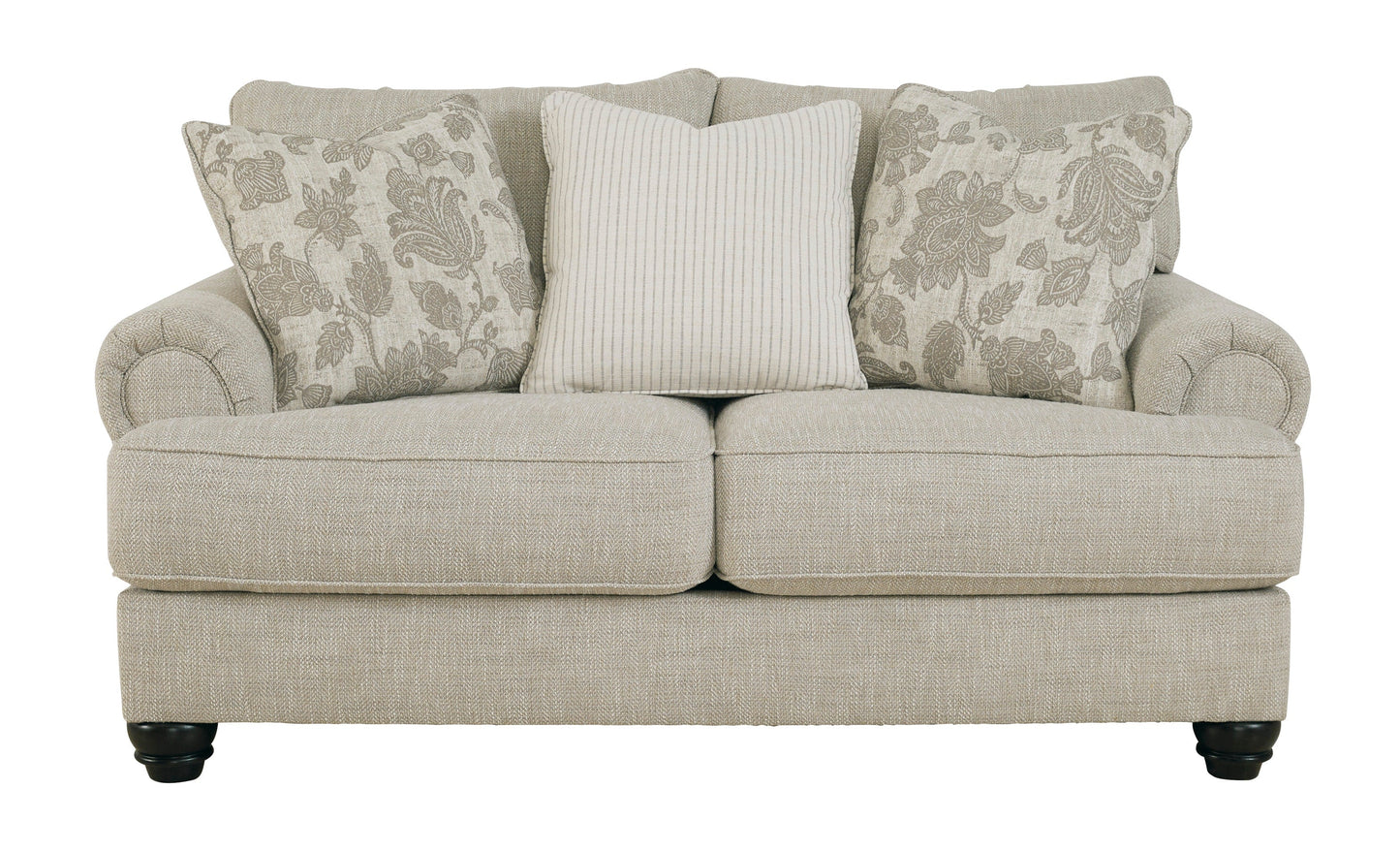 This loveseat has an alluring look that's guaranteed to turn heads. Richly textured fabric in a light, easygoing hue is enhanced by even lighter flax peeking through. Distinctive roll arms add a dab of debonair, while indulgently plush cushions cradle you softly. Sit back and relax in comfort and style, with plenty of room to stretch out and unwind at the end of a long day.