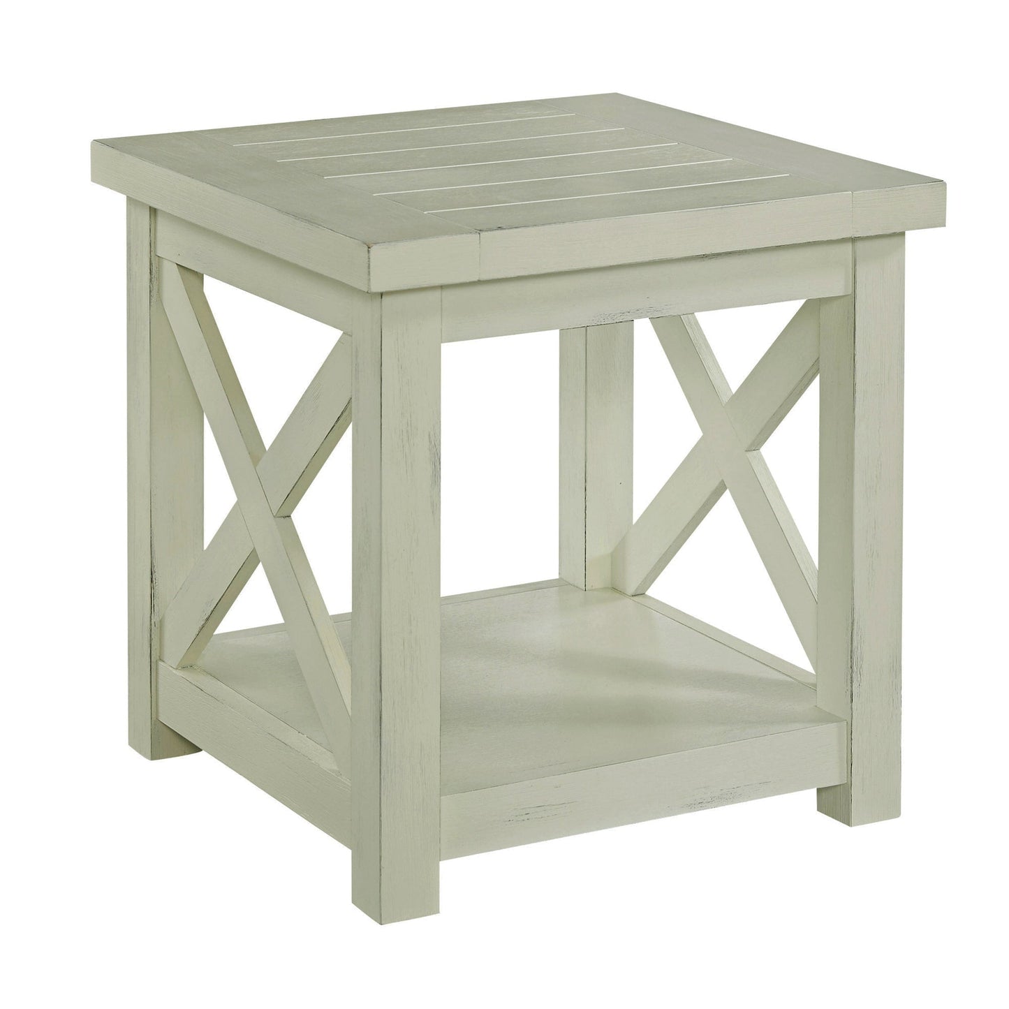 The rustic aged look of weathered wood combines with a signature “X" frame pattern to provide a warm inviting cottage feel. Wire brushed wainscot inset mahogany veneer panels and wire brushed solid mahogany frames provide a unique weathered look. The wide frame includes a plank top design and a lower shelf for storage.