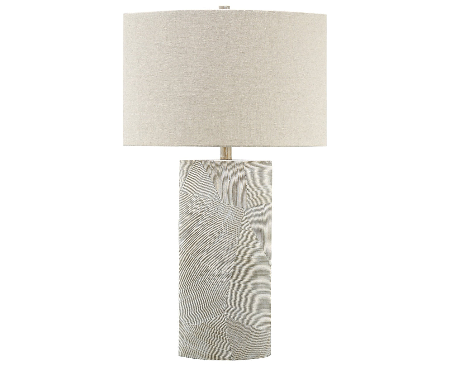 The rustic natural beauty of this table lamp makes it perfect for illuminating any room. Its brown and ivory resin base is complemented with a straight-side oval hardback shade. Low profile yet elegant, this lamp makes a gorgeous accent for contemporary spaces.