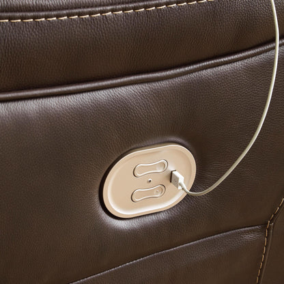 Load up on comfort in a cool, clean-lined and contemporary way with this power reclining loveseat with console in chocolate brown. Rest assured, the leather match upholstery is enriched with a pebble grain effect for authentic appeal and enhanced with jumbo stitching for dramatic contrast. It features a one-touch power control with adjustable positions, along with an Easy View™ adjustable headrest that allows a primo view of the TV even when you're reclined. Extended ottomans provide extra length for leg comfort. A zero-draw USB plug-in at your fingertips lets you charge up as you chill out.