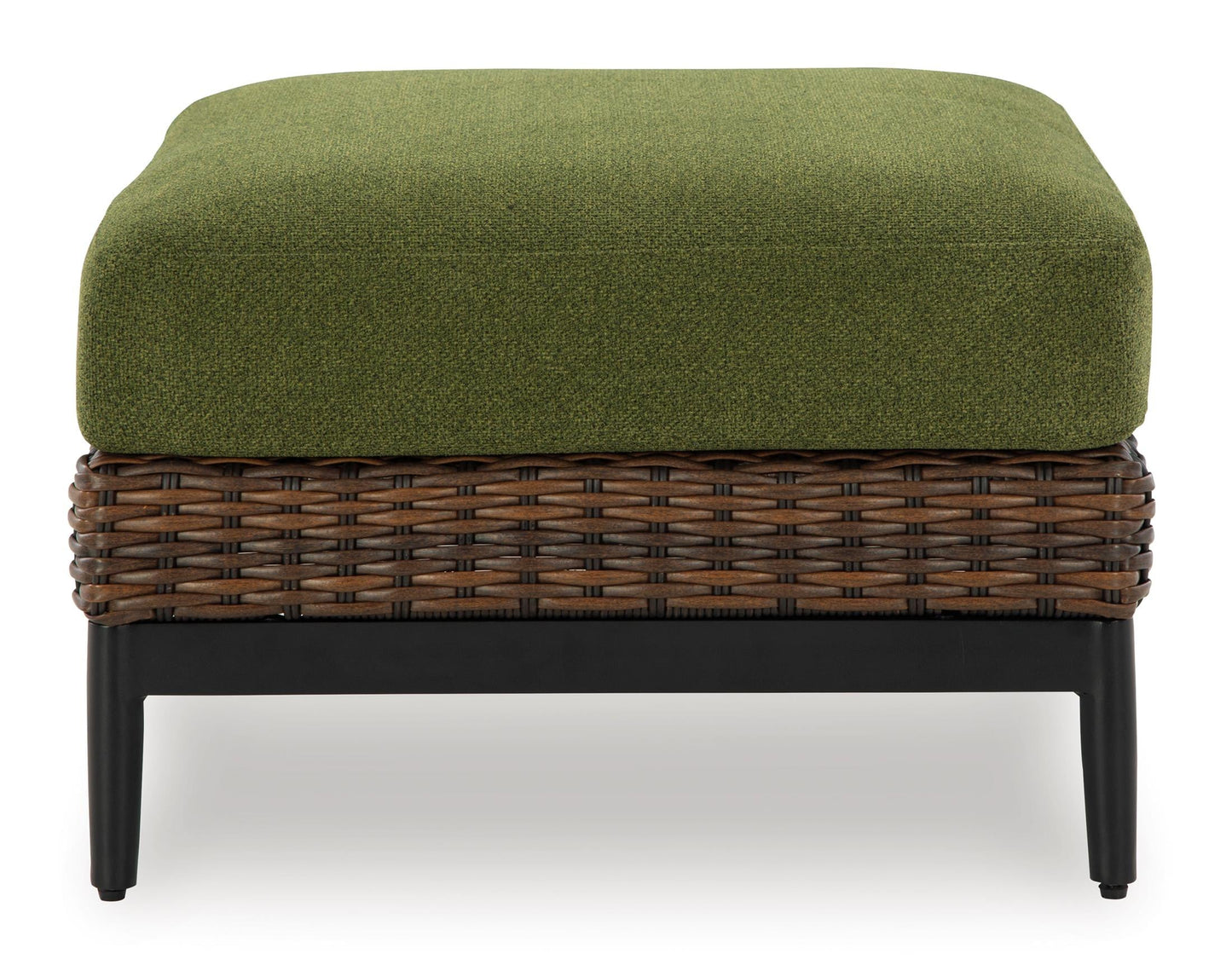This outdoor ottoman recalls the aesthetics of nature to bring an inviting, high-style feel to your patio or lanai. Its Nuvella+™ performance fabric is made with enhanced UV resistance, so the chic green hue stays brighter for longer. Worried about the weather? Don't sweat it—the durable resin wicker withstands the elements from season to season.