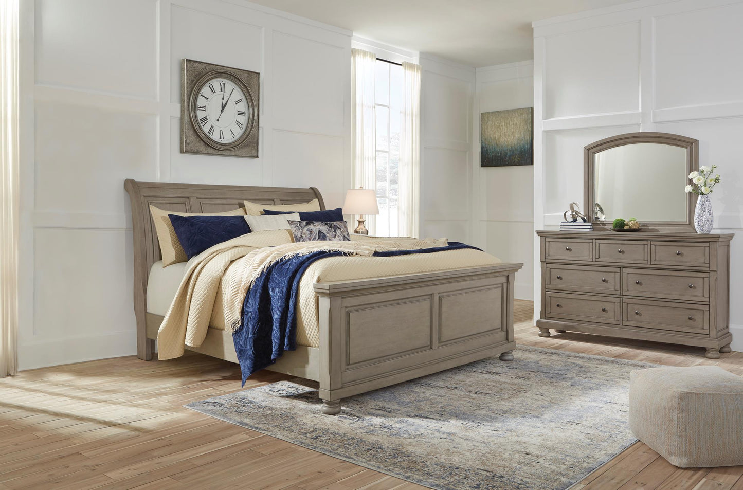 Satisfying your taste for tradition, the Lettner California king sleigh bed sports serene sophistication. Forever classic design details like inset panels and bun feet are so easy to love. A burnished light gray finish elevates the look with modern sensibility, so you can sleep in style.