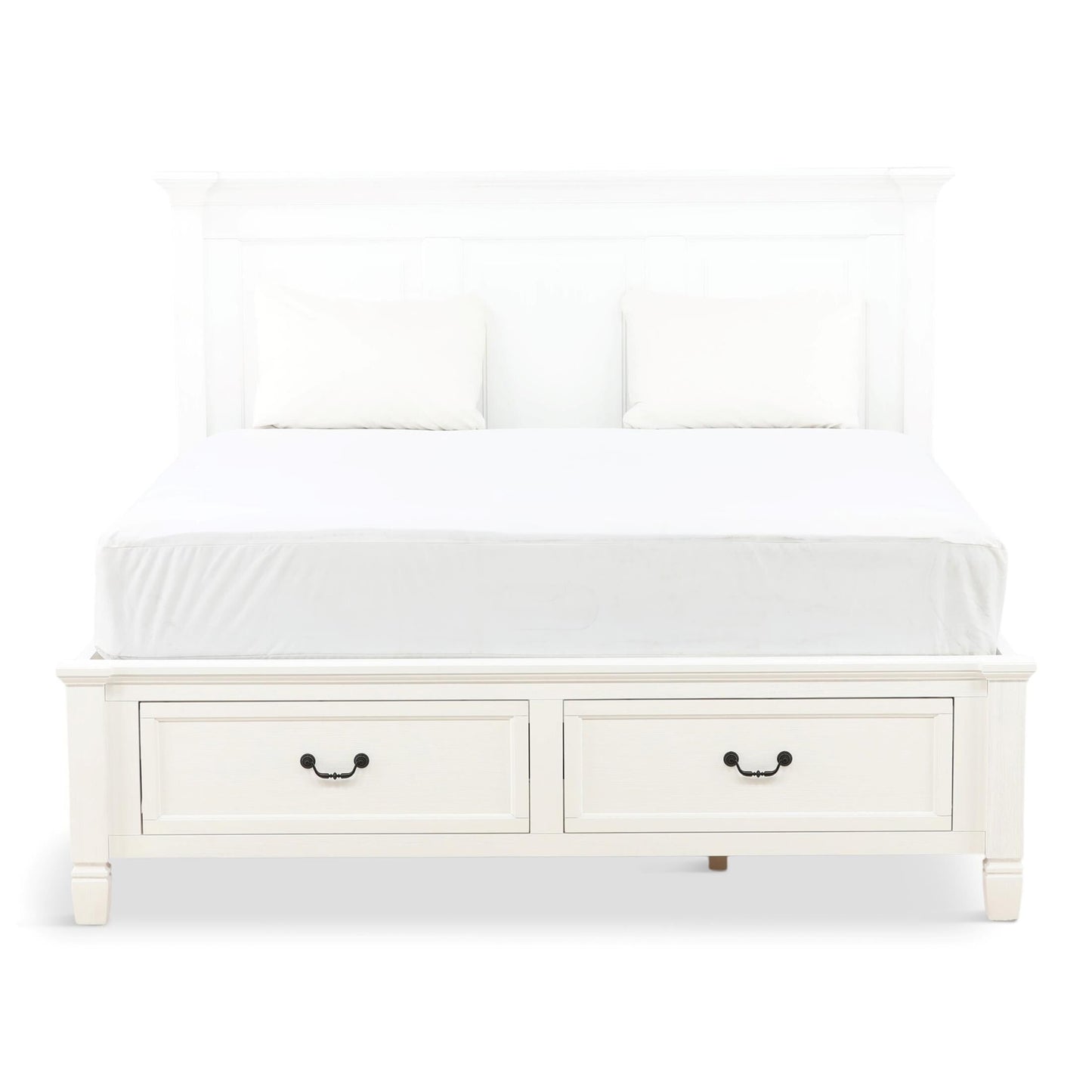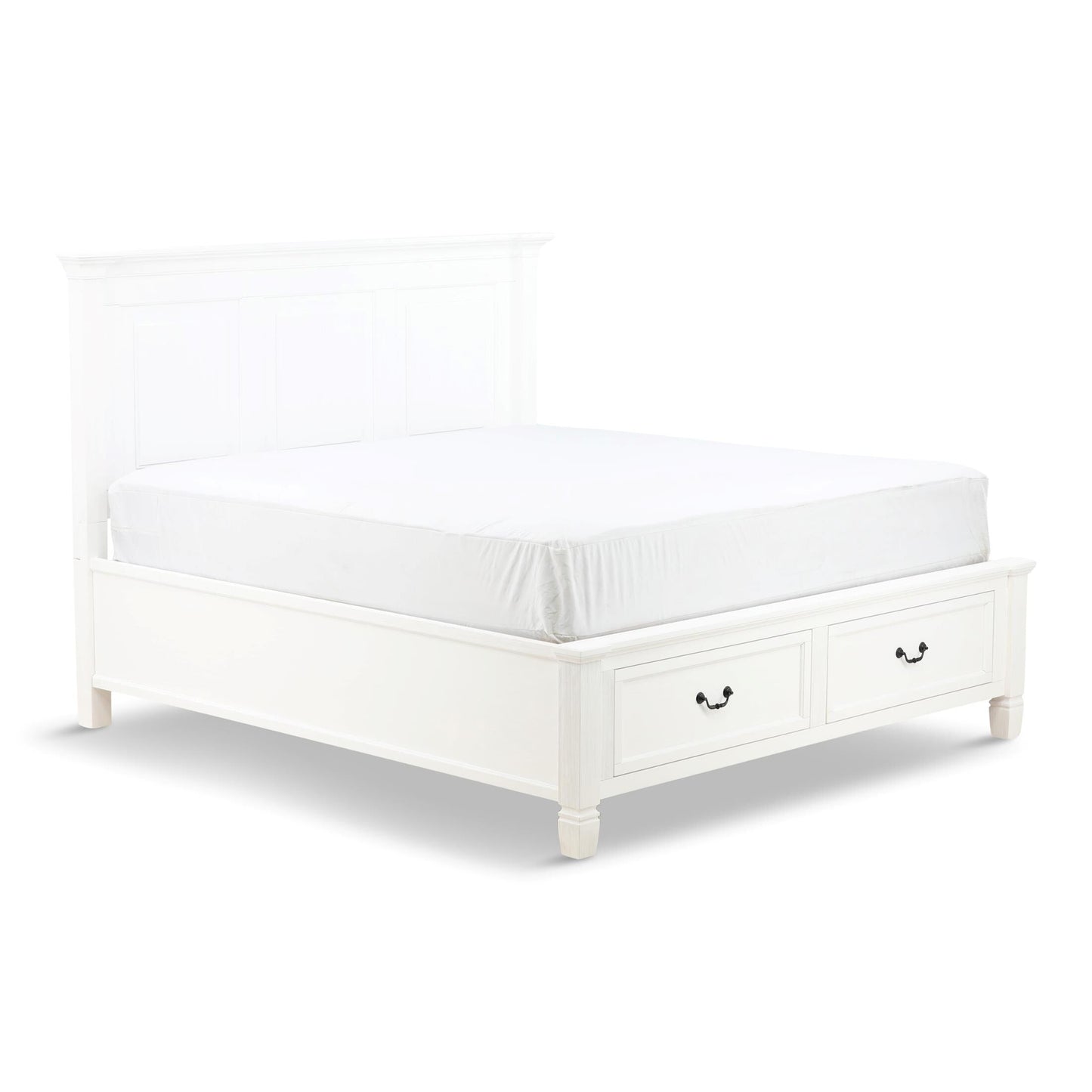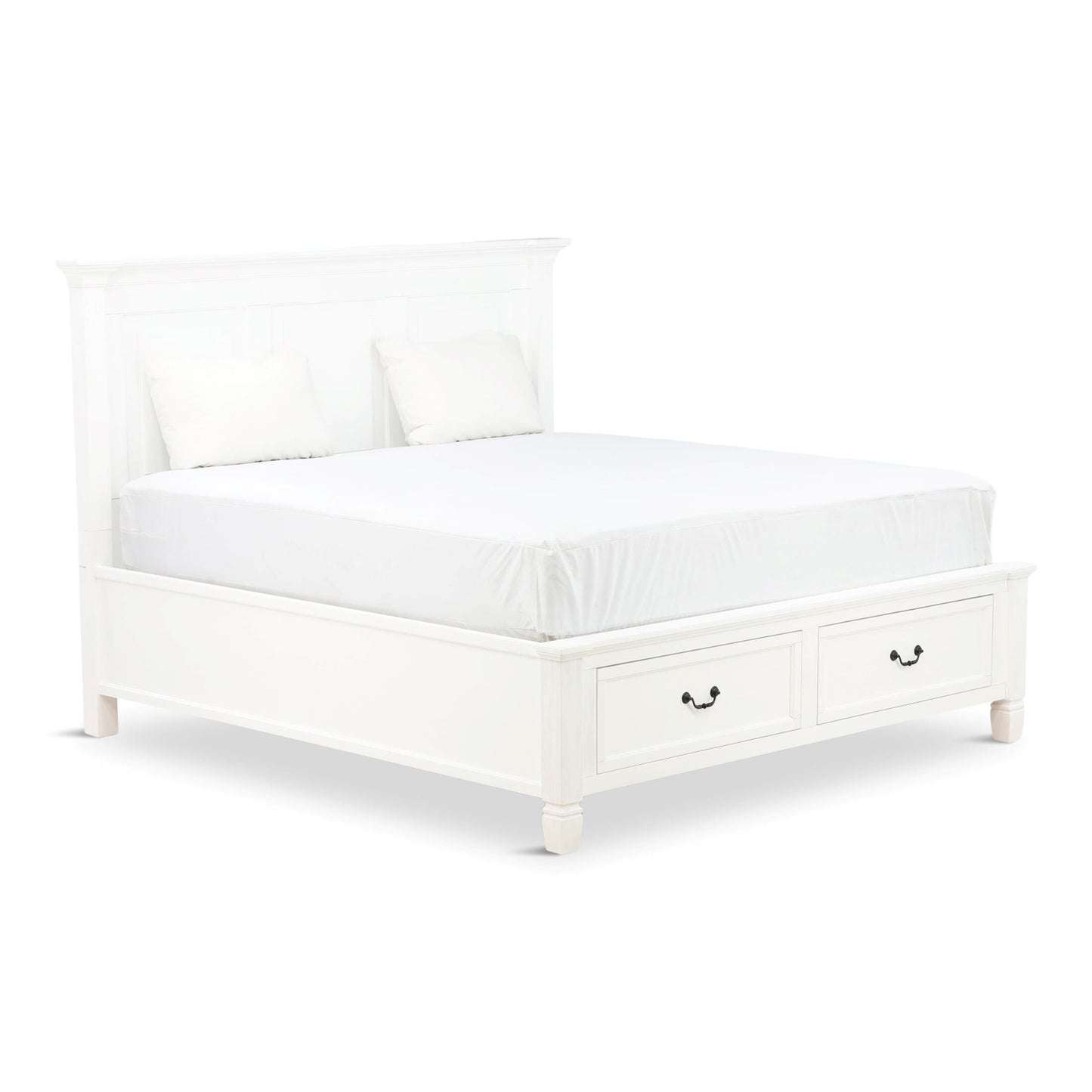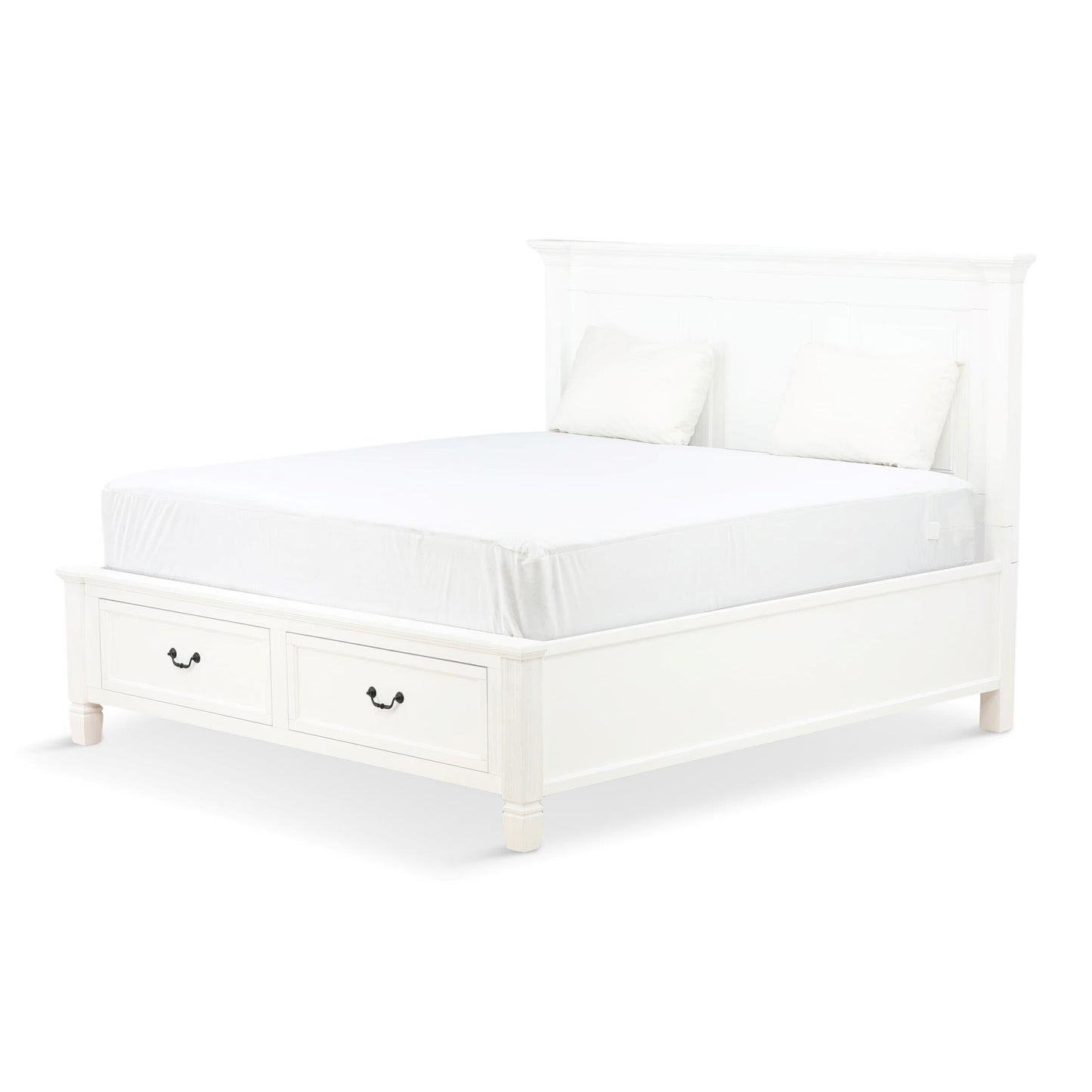 The Orchard King Storage Bed is warm, inviting and fashionably chic, creating the retreat of your dreams. The vintage inspired collection features a multi-step, antique white hand applied finish. Unique details such as the mantel ends on the panel headboard, tapered feet and antique hardware add to the overall charm. Extra storage is incorporated, with the storage footboard panel bed.