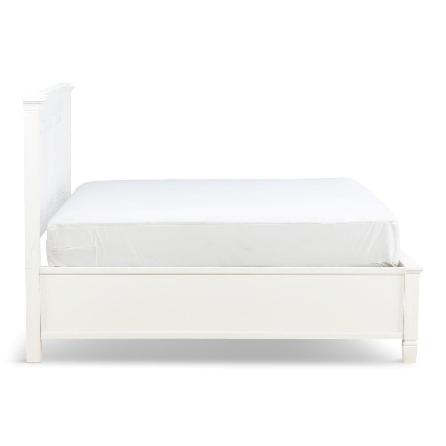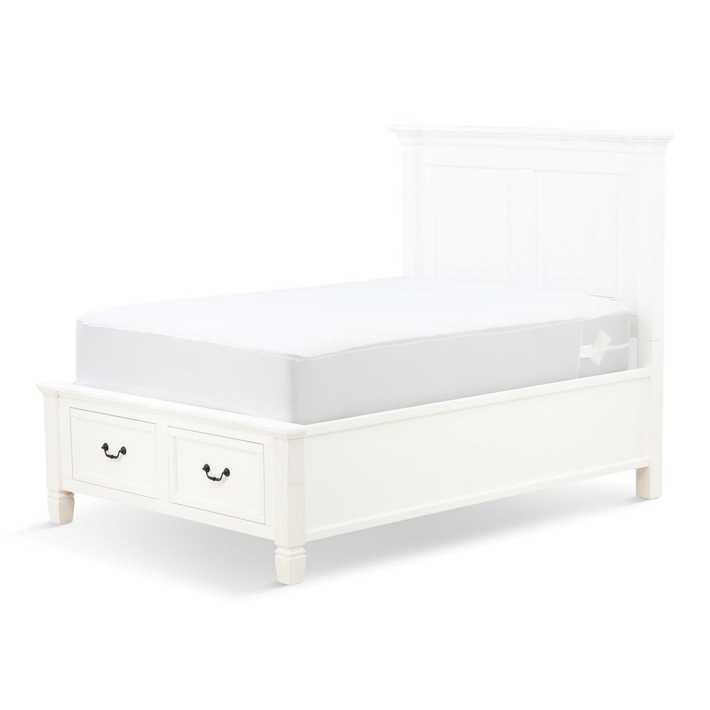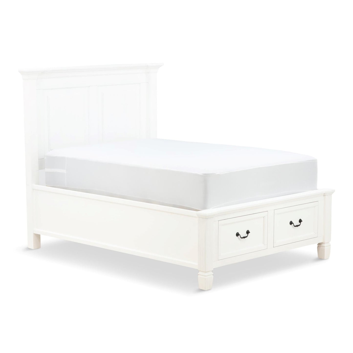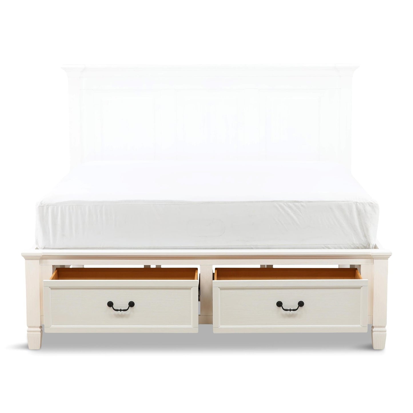 The Orchard King Storage Bed is warm, inviting and fashionably chic, creating the retreat of your dreams. The vintage inspired collection features a multi-step, antique white hand applied finish. Unique details such as the mantel ends on the panel headboard, tapered feet and antique hardware add to the overall charm. Extra storage is incorporated, with the storage footboard panel bed.
