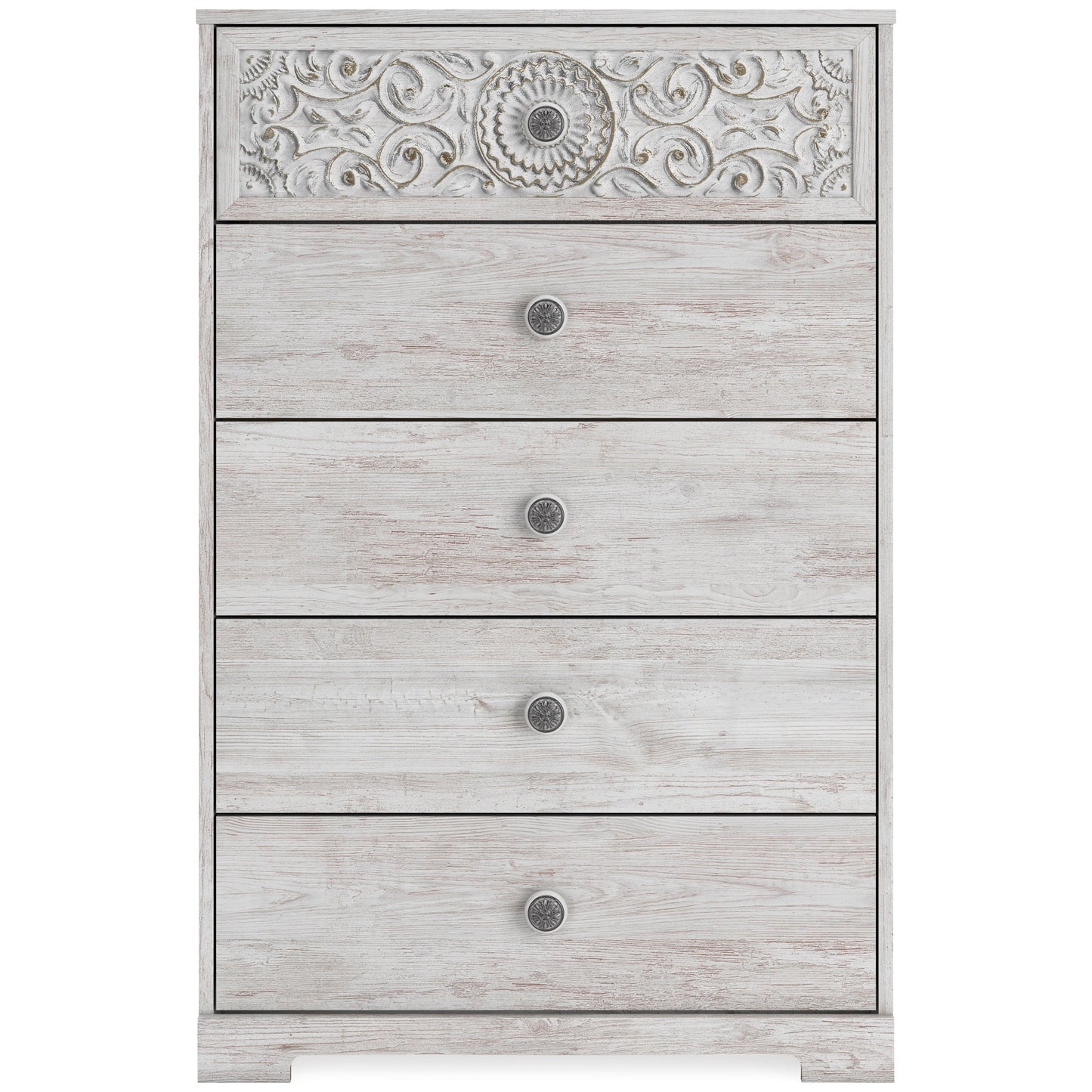 If it's coastal chic or cottage quaint style you long for, this whitewashed chest of drawers invites you to go to town. Its distinctive weatherworn finish conveys an easy-breezy sensibility, perfect for a restful bedroom retreat. Tastefully edited lines and medallion drawer pulls give this attractively priced chest a high-end aesthetic.