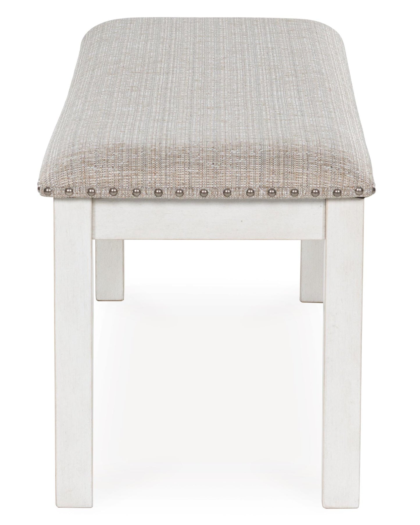 The Robbinsdale dining bench is sure to impress come mealtime. With its antiqued white finish and light gray upholstery with nailhead trim, modern farmhouse-style dining has never been so fashionable. All that's missing is you and your family.