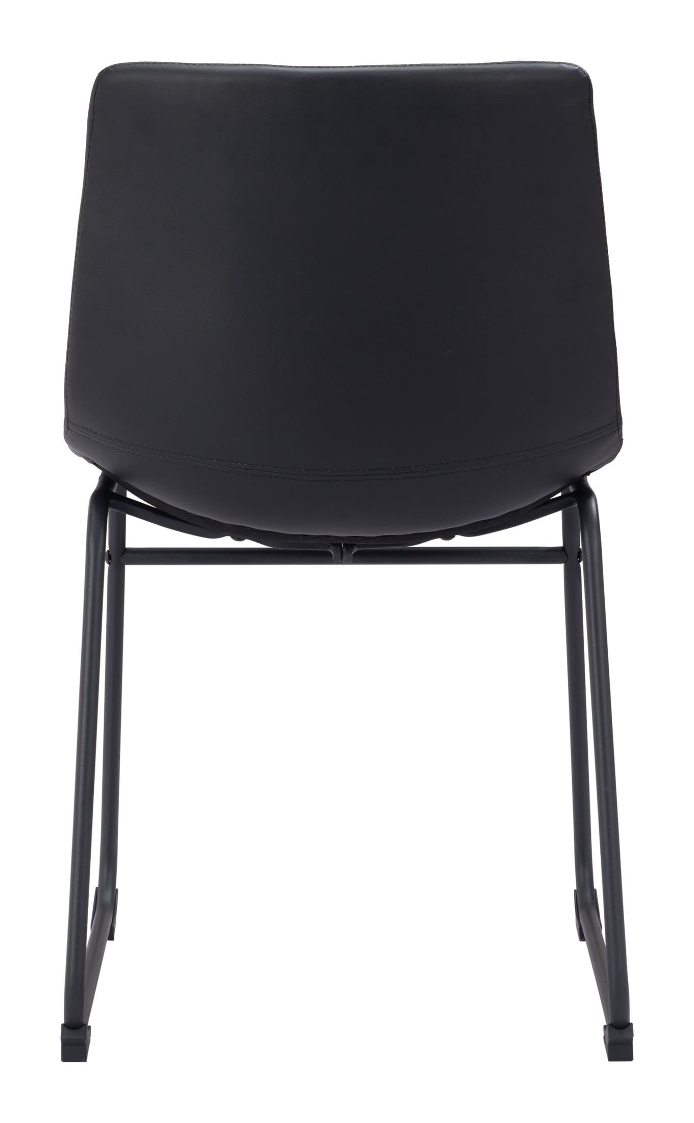 This dining chair's seat and back are built with a sculpted design for comfort. It's upholstered in a soft 100% Polyurethane fabric, with a slim profile metal base and a crossbar for stability. The frame is finished in matte black, for a universal appeal.