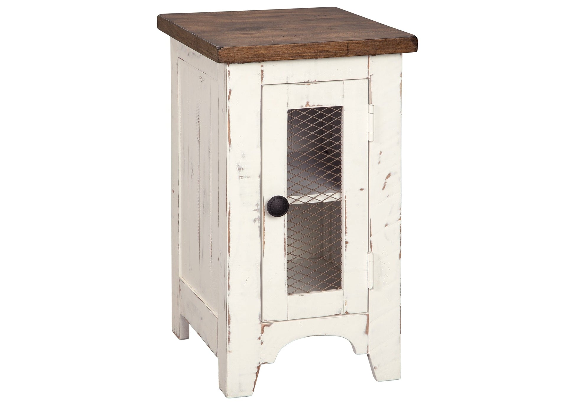 Double take. Sporting a two-tone finish that pairs a distressed vintage white with aged natural pine color, this chairside end table elevates the art of rustic farmhouse living. Enhancing its charm: shelved storage visible through the cabinet door with inset metal grill.
